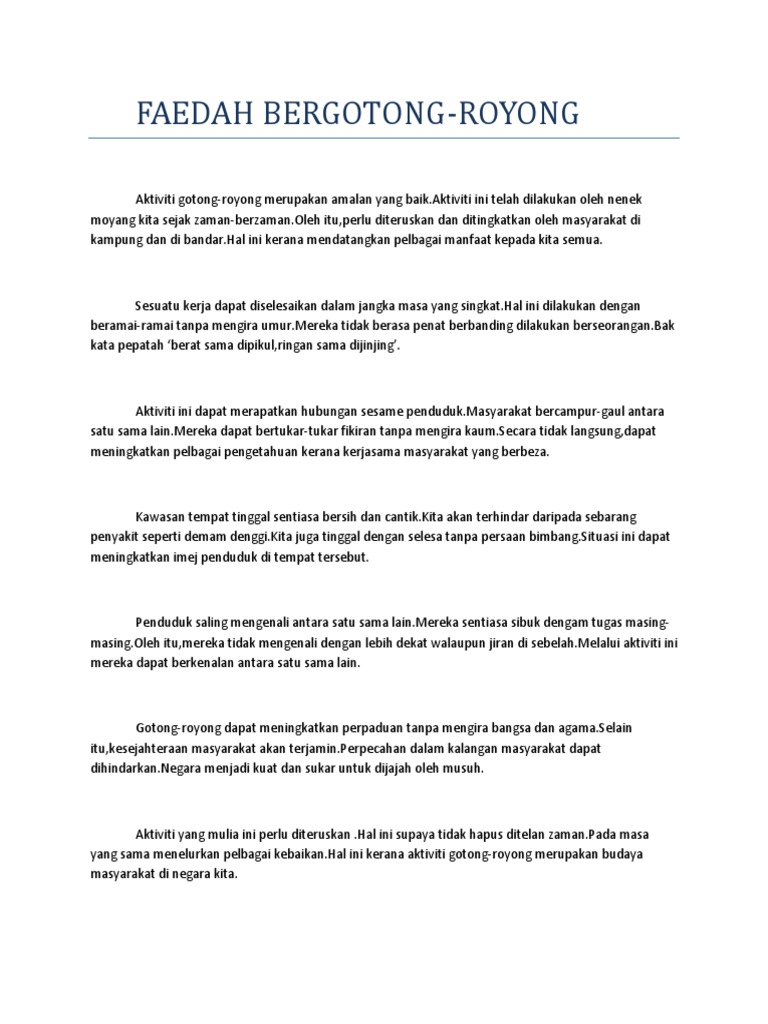 Contoh Karangan Kelebihan Amalan Gotong Royong Dalam Masyarakat Kebaikan. Bahasa Melayu BM Gradelevel. Aktiviti Gotong-royong luk zi han - July 8 2018 at 519 pm.